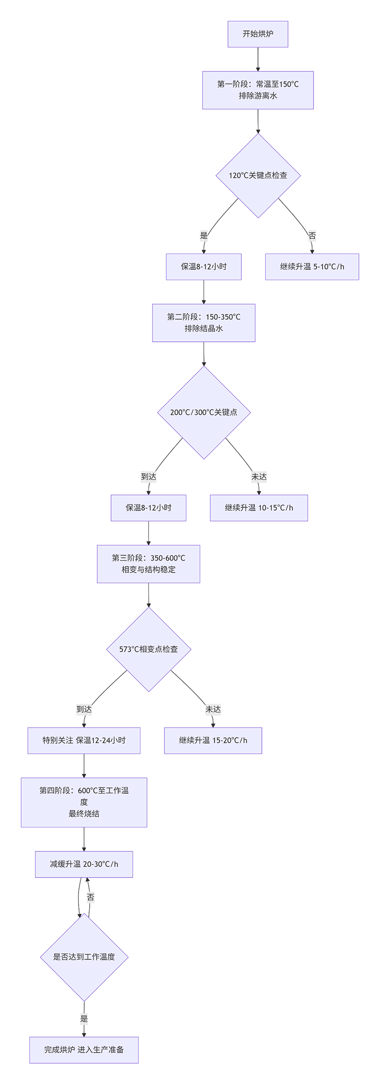 典型的烘爐過(guò)程可分為四個(gè)關(guān)鍵階段,每個(gè)階段都有其特定的物理化學(xué)變化和控制要點(diǎn):階段一:常溫至150℃——游離水排除期